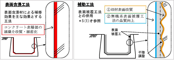 コンクリート表層部の改質:ひび割れ透水性、防水性、すり減り抵抗性、表面硬度、アルカリ性付与性