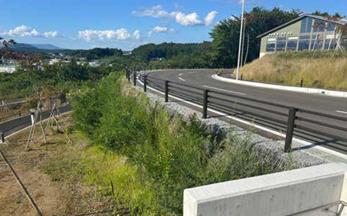 国道や市道からこの施設へのアプローチとなる道路において、のり面の張り出しを最小限に抑える役割を果たしているのが、「トリグリッドEX」+鋼製壁面材「トリパネル」によるジオテキスタイル補強盛土工法です。