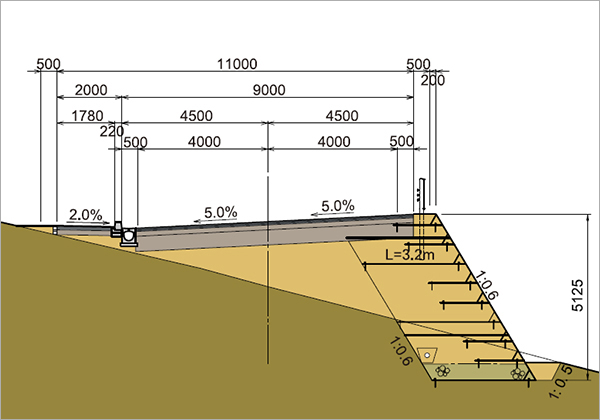 本件の壁面勾配は1:0.6のため分類上は補強盛土工法となり、比較的軟弱な地盤に構築しています。また盛土材は主に砕石を使用していますが、植生に問題が出ないよう壁面裏のみ土砂を用いるなどの工夫を盛り込んでいます。