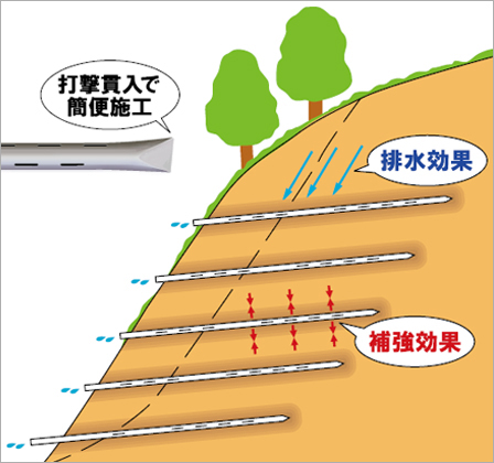 PDR工法は、打撃挿入の締固め効果により地盤の安定を高めつつ、ストレーナー加工されたパイプ形状により必要な排水機能を持たせた、一挙両得の工法です。