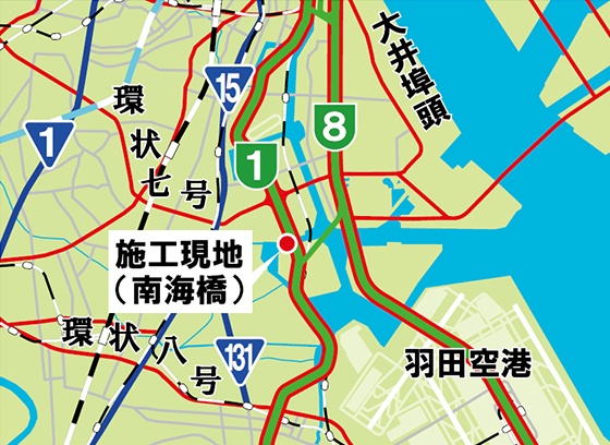 「南海橋」は東京都の湾岸部、首都高1号羽田線及び都道日本橋芝浦大森線が「ガスミオ運河」を越え平和島と昭和島を結ぶ橋です。直近に位置する平和島ジャンクションが日々2万7千台の交通量を抱えるなど臨海部の重要な物流インフラの一端を長年にわたって担ってきました。