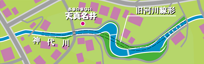 この天真名井が面する一級河川五ヶ瀬川の支流・神代川(くましろがわ)は増水対策のためこれまで直線的なコンクリート三面張りで固められていましたが、「神話の里」に相応しい景観をとの強い要望が地元住民から寄せられていました。