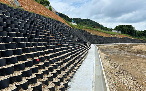 ジオセル擁壁工法はハニカム状に展開したジオシンセティックス材により中詰め土を拘束、安定した法面を構築する工法で、軽量な材料での迅速な施工や、中詰めに現地発生土を有効利用できるなど、様々な利点を備えています。