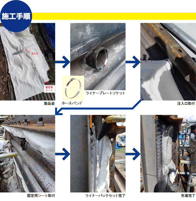 従来、ライナープレート端部と地山の隙間は、小型土のう等を使用して塞ぎ充填材を充填していましたが、隙間から充填材が漏れたり、充填が確実に出来ない場合がありました。 これを解決するのが特殊充填袋「ライナーバック」。上下方向( 幅方向) に伸びる構造により空隙の充填が確実に行え、作業時間の短縮にもつながります。